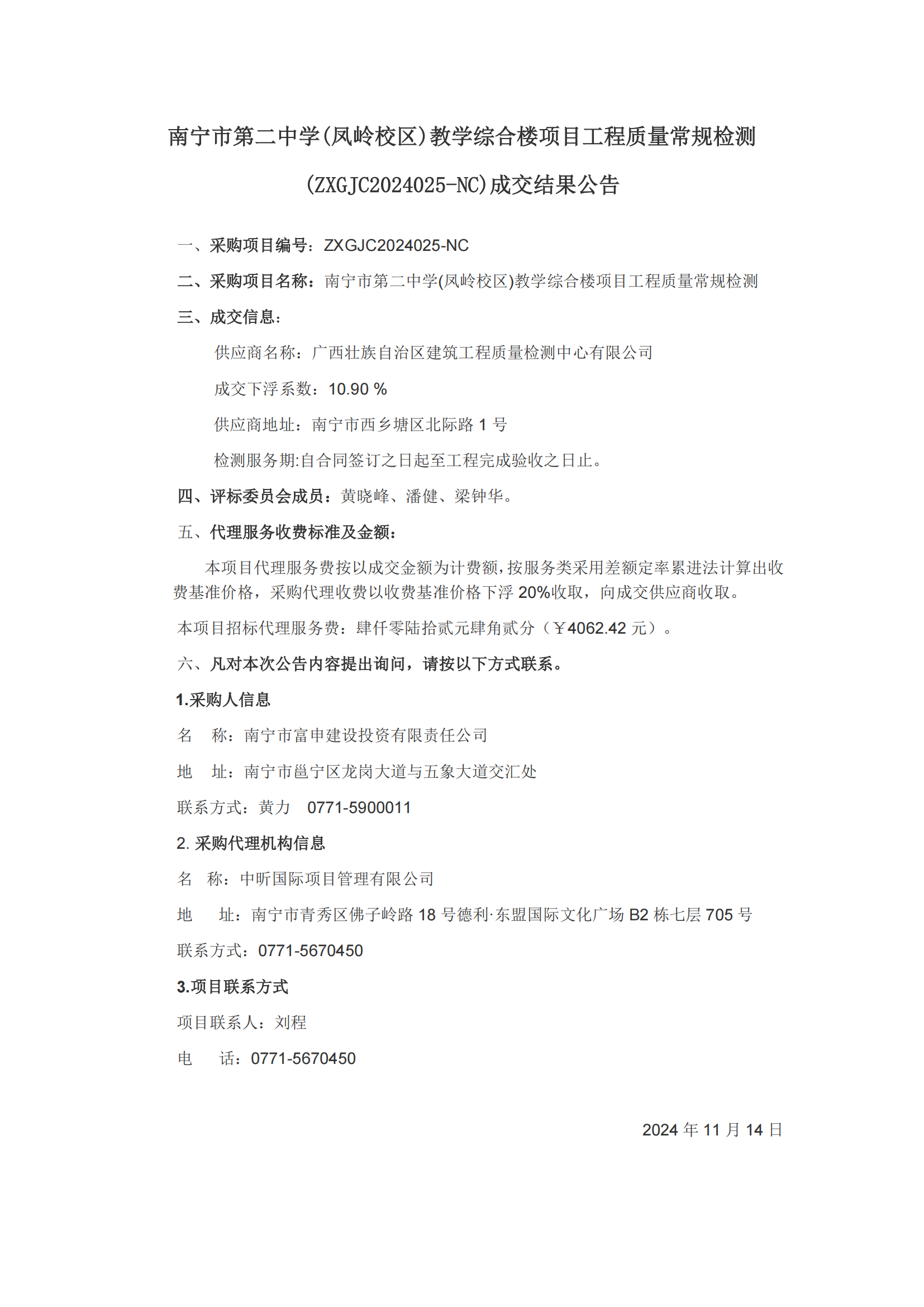 南宁市第二中学(凤岭校区)教学综合楼项目工程质量常规检测 (ZXGJC2024025-NC)成交结果公告